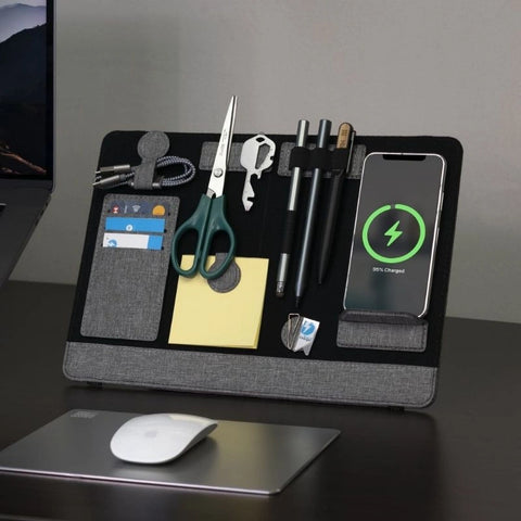This desk organizer offers a 15W fast wireless charging (adjustable) phone stand, a clipboard, two magnetic docks, a pen holder, card holder, a cable clip and a phone stand. It have Grippy Silicone Band for a quick and practical attachment to your laptop, to be used with 13ā-16ā computers.