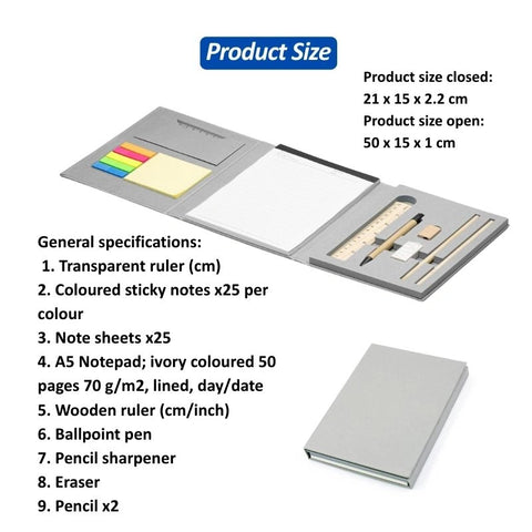 Include: Transparent ruler, colored sticky notes * 25 per color, Note Sheets*25, A5 notepad 50 pages, Wooden Ruler, Ballpoint pen, Pencil sharpener, Eraser, Pencil *2