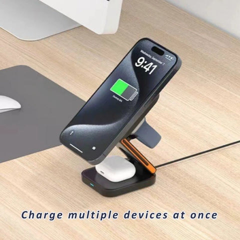 Power up your essentials with the Multi-Device Foldable Wireless Charger, a 3-in-1 magnetic charging solution designed for peak efficiency and portability. This sleek station features powerful MagSafe-compatible magnets that snap your phone into the perfect charging position every time, even through most protective cases up to 5mm thick. Built for the modern traveler, its innovative Z-fold design allows it to transform from a multi-angle viewing stand into a pocket-sized square for easy storage. With high-speed, safe charging technology that protects your battery, itās the ultimate desk or bedside companion for your smartphone, smartwatch, and earbuds.